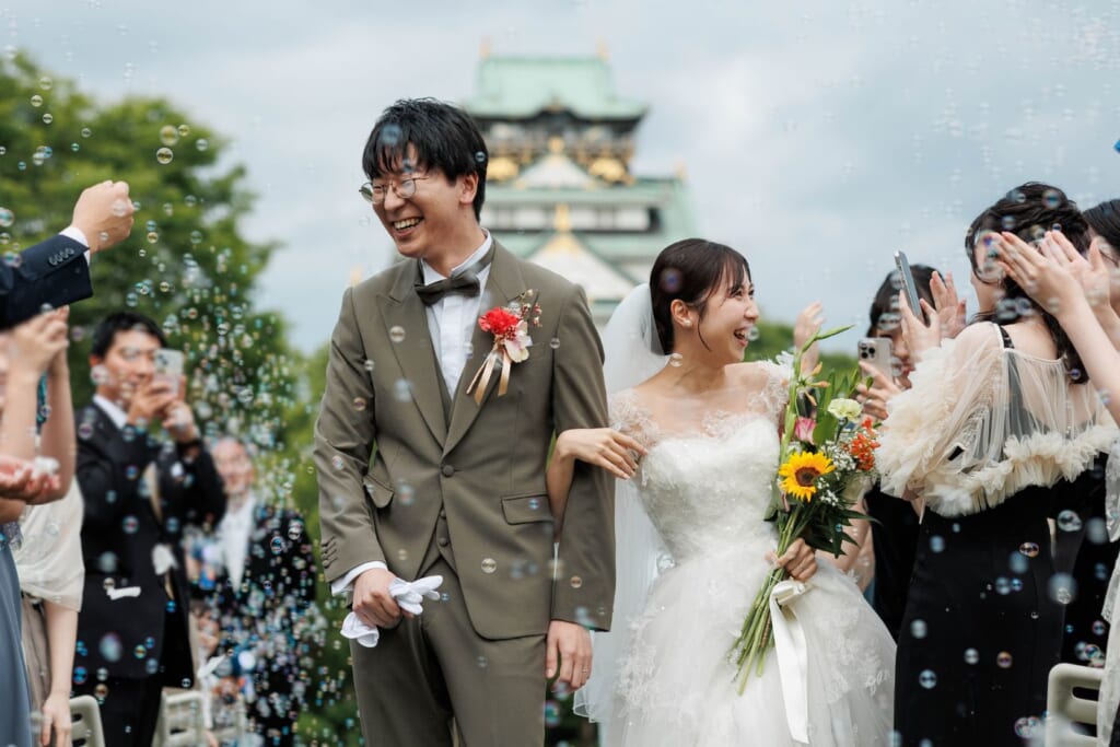 おふたりが運命の舞台として選ばれたのは、大阪城公園の豊かな自然に抱かれた、大阪迎賓館。決め手となったのは、大阪城を望む美しいガーデンでした。歴史と和の趣が感じられる落ち着いた雰囲気に、おふたりらしさが合わさることで生まれる唯一無二のオリジナル空間に。他の式場とは一線を画す、貸し切りならではのゆったりとした時間の流れと、緑豊かな自然が、おふたりの心を強く惹きつけました。