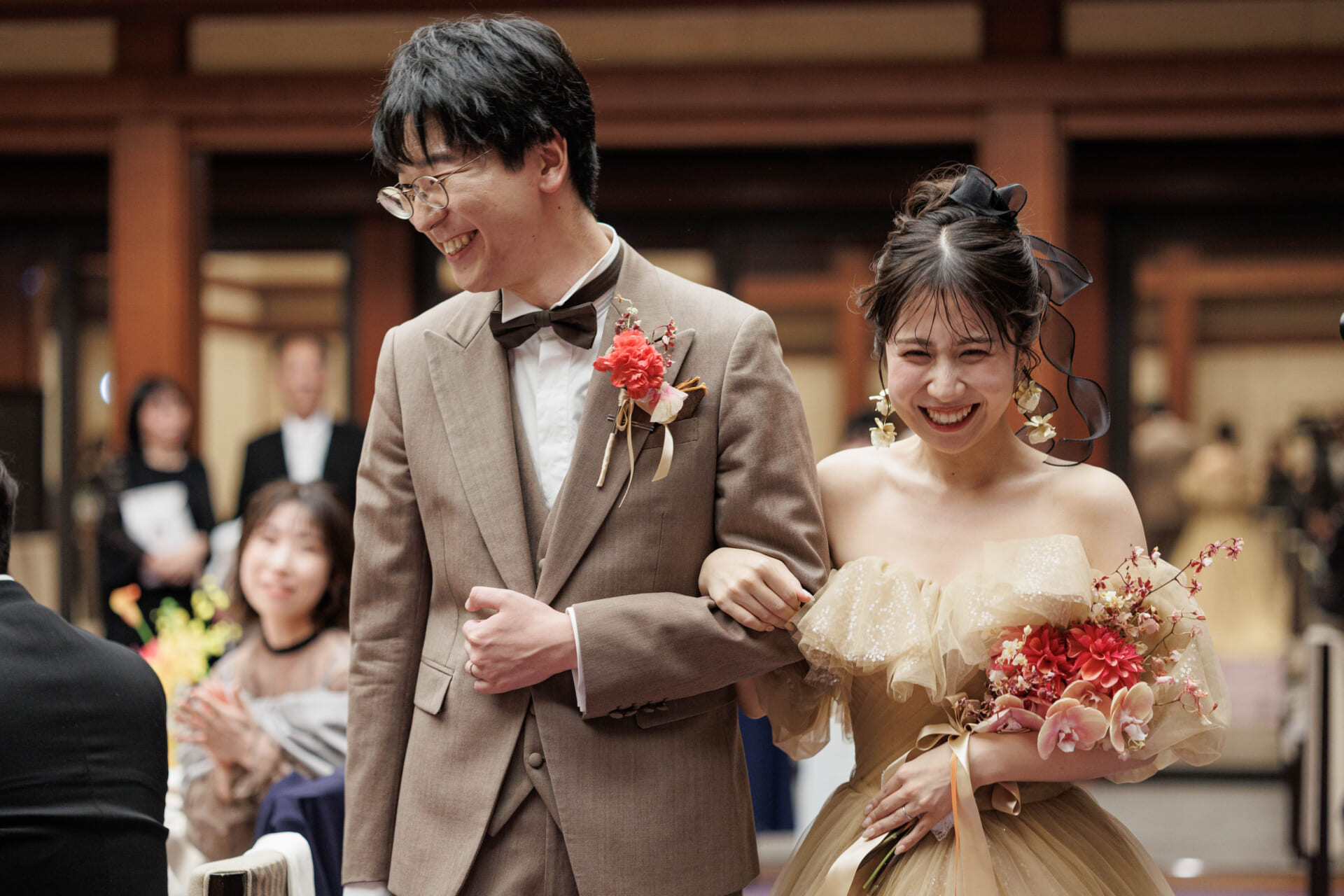 お色直しでは、新婦様の柔らかい雰囲気にぴったりのウォームベージュのドレスでご登場。ガーデン側からのサプライズ入場に、会場からは大きな歓声が上がりました。ゲストとの語らいの時間を楽しまれた後、披露宴の最後には、親御様への感謝のお手紙が読まれ、会場は感動に包まれました。記念品として贈られたのは、おふたりが生まれた時と同じ体重米と、ご両家の愛犬をデザインしたビッグクッション。笑いあり、涙あり、たくさんの思い出が生まれた、かけがえのない一日となりました。