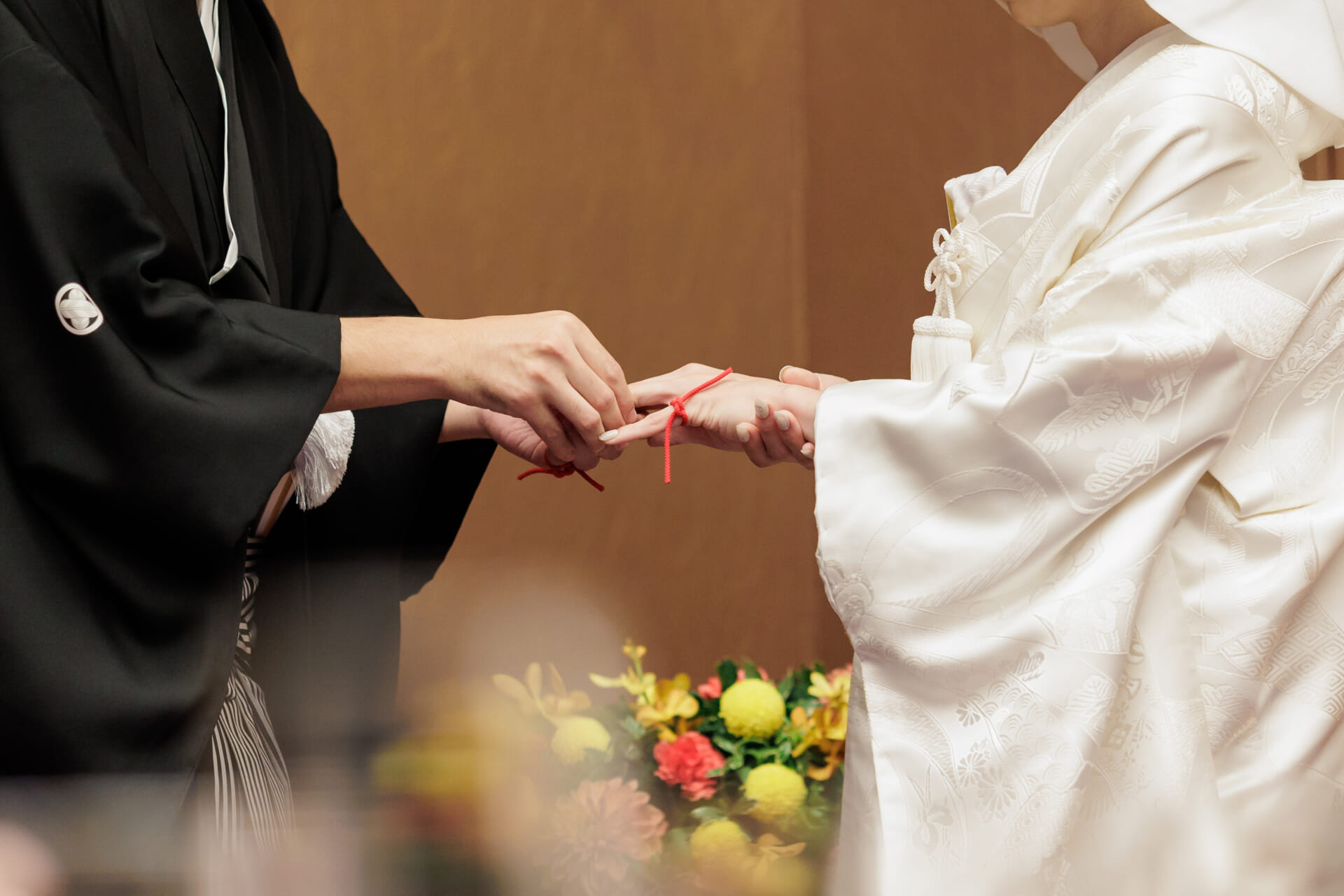 ファーストミートから始まった、おふたりの特別な一日。白無垢をお召しになられた新婦様と対面された新郎様の目には涙が。新婦様を愛おしそうに見つめる新郎様の姿は、心が震えるような感動的なワンシーンとなりました。おふたりが選ばれた挙式スタイルは、当社オリジナルの「人前和婚式~縁~」。おふたりの愛猫のがんもちゃんの肉球スタンプ付きの、オリジナルの結婚証明書をご用意され、誓いの言葉を交わされました。そして、ご家族の皆様で盃を交わし、夫婦の契りを結ぶ「三々九度」の儀式も執り行われ、会場は温かい笑顔と感動に包まれました。