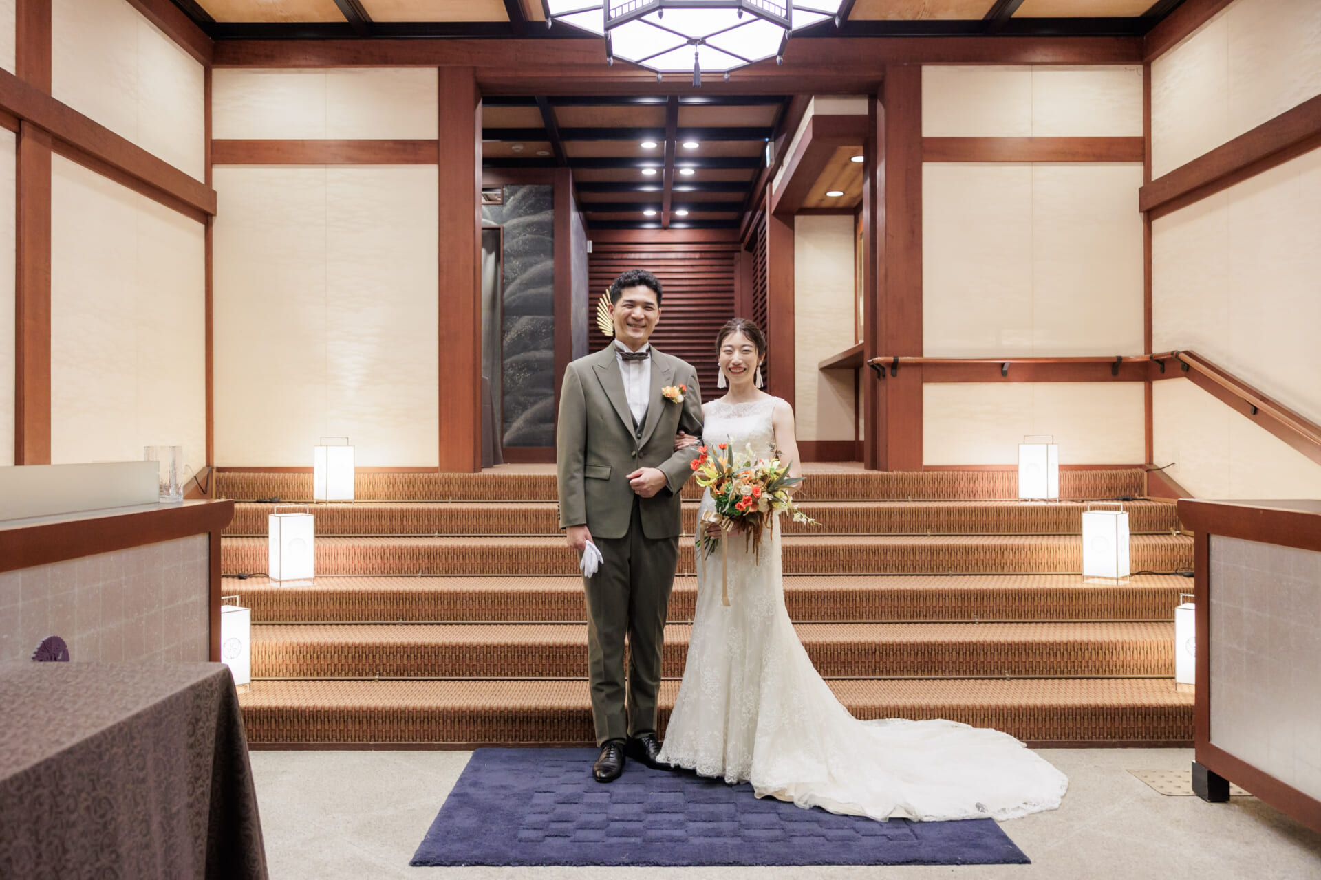 おふたりが選ばれたのは、大阪城公園の豊かな緑に抱かれた大阪迎賓館。その決め手となったのは、アクセスの良さはもちろん、お茶室のような趣のある空間。そして、400年の歴史を紡ぐ大阪城を望む、唯一無二のロケーションでした。また、ゲストへのおもてなしとして、こだわりのお料理も大きな魅力。ゲストへのおもてなしを何よりも大切にされていたおふたりにとって、この場所はまさに理想の舞台でした。